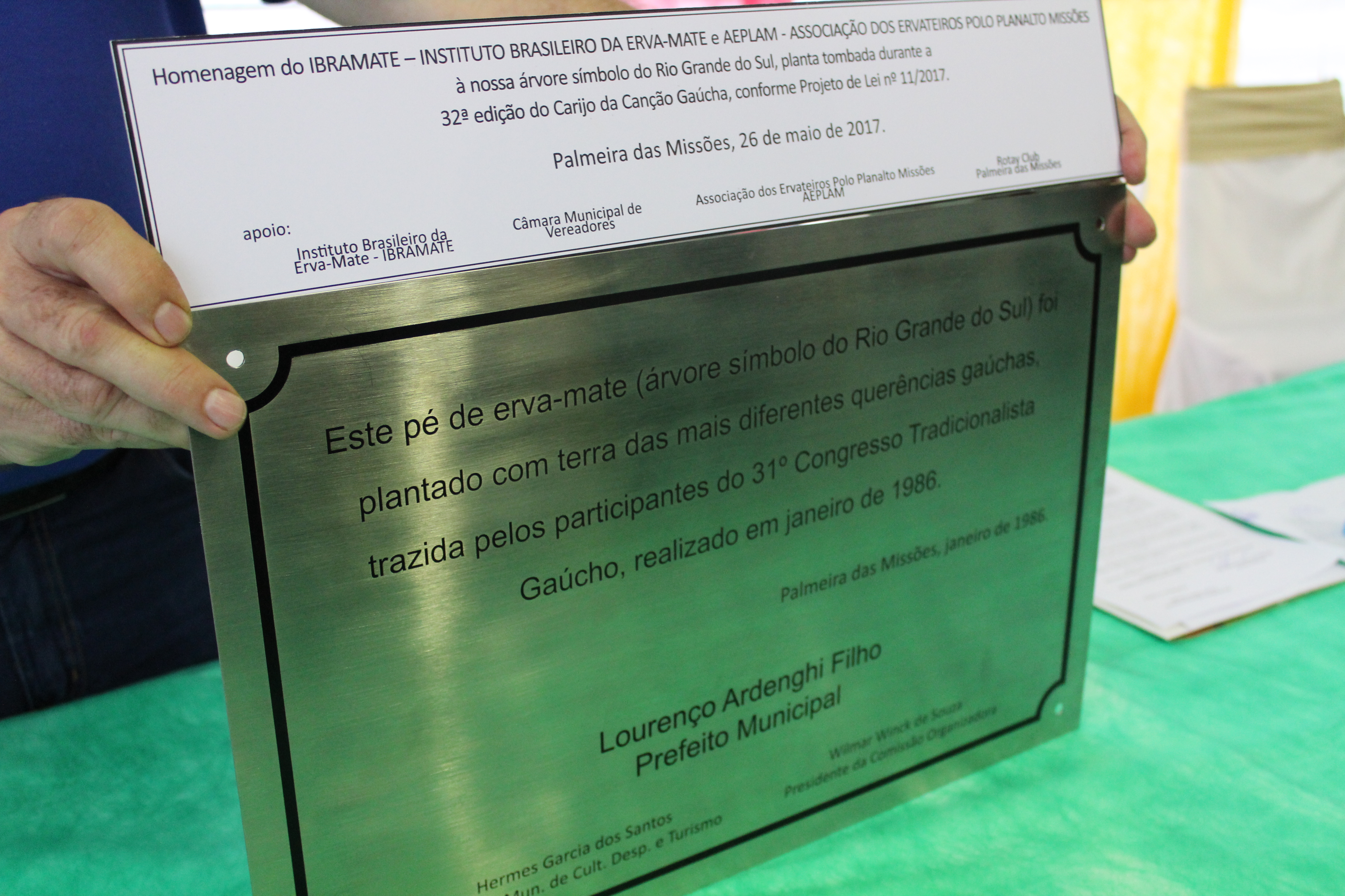 Na tarde desta sexta-feira, 26, na Casa de Cultura durante o 32ª Carijo da Canção Gaúcha o prefeito municipal Eduardo Russomano Freire sancionou o Projeto de Lei Legislativo 011/2017 que tomba o pé de erva-mate plantado em frente do Pavilhão Vicente da Silva Machado Netto, no Parque de Exposições Tealmo José Schardong. Segundo o vereador Maninho Saggin, o tombamento é importante para preservar a cultura de Palmeira das Missões. “Temos que preservar e manter as tradições. Por meio deste tombamento queremos preservar a cultura do município, pois Palmeira foi criada por meio do cultivo da erva-mate onde os tropeiros passavam aqui e o comércio baseava-se no produto. Palmeira das Missões é sim filha da erva-mate”, afirmou.